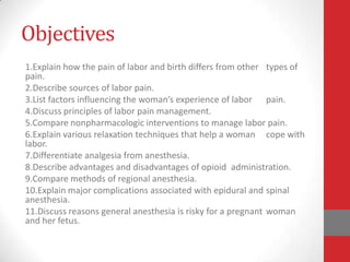 This document discusses pain management during labor and childbirth. It explains that labor pain is unique compared to other types of pain. Sources of labor pain include cervical dilation, uterine contractions, and fetal descent. Factors like preparation, culture, anxiety and fatigue can influence a woman's experience of pain. Non-pharmacological methods for managing pain include breathing, positioning, water therapy and relaxation techniques. Pharmacological options include opioids, epidural anesthesia and spinal anesthesia, each with advantages and disadvantages. Complications of regional anesthesia include hypotension and fetal distress. General anesthesia is riskier for mother and fetus due to issues like failed intubation or aspiration.