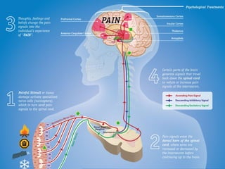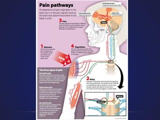 This document provides an overview of pain medicine. It defines pain and discusses its epidemiology, economics, and physiological effects. It describes acute and chronic pain, including their presentations and pathophysiology. Neuropathic and nociceptive pain are major categories discussed. Pain pathways and the gate control theory of pain are also summarized. Psychiatric comorbidities with chronic pain are noted.