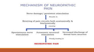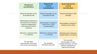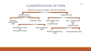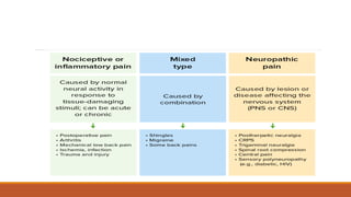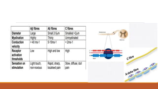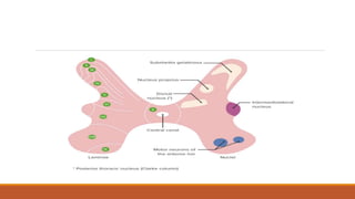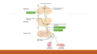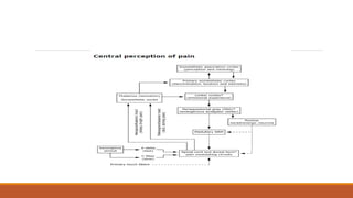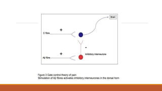 III. Key aspects of acute and chronic pain are distinguished. The gate control theory proposes that non-painful stimuli can inhibit pain transmission at the dorsal horn. Overall the document provides a comprehensive overview of