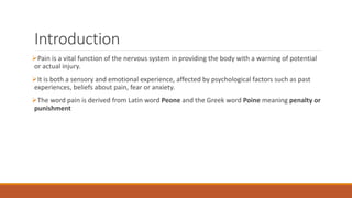 II. The document outlines the history of pain theories, definitions of pain terminology, embryological development of pain pathways, types of pain, and components of the pain pathway including nociceptors, neurons, and brain regions involved in perception.