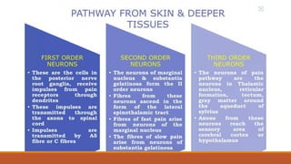 I. Pain pathways involve nociceptors detecting damaging stimuli and transmitting signals along primary afferent neurons to the dorsal horn. Signals then project up the spinal cord and through ascending tracts to various brain regions for processing. Descending pathways from the brain modulate pain transmission.