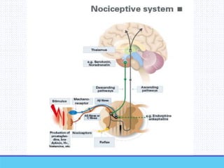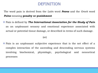 The document provides an extensive overview of pain, its definitions, classifications, and mechanisms. It details various types of pain such as acute, chronic, neuropathic, and their respective characteristics, while also discussing pain management strategies including pharmacological and non-pharmacological approaches. Additionally, it covers the pathophysiology of pain, assessment methods, and the role of the nervous system in pain perception.