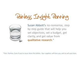 The e-book 'Painless Insight Planning' by Susan Abbott provides tools and guidance for conducting qualitative research to derive actionable insights, emphasizing the importance of clear objectives. It includes practical exercises for brainstorming and planning to ensure effective research that addresses specific business challenges. The book is available for free download and encourages sharing among those who could benefit from it.
