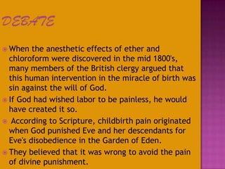 The document discusses the history and debate around pain relief during childbirth. Originally, some clergy argued that pain relief interfered with God's will. However, Queen Victoria's painless birth using anesthesia influenced public acceptance. The document then describes various pharmacological (parental drugs, inhalational agents, regional blocks) and non-pharmacological (hypnosis, water birth, massage, music) methods for pain relief during labor and their benefits, risks, and mechanisms of action. Regional blocks like epidurals provide effective relief but require medical expertise and monitoring. Non-drug methods like hypnosis, water birth and massage can also help reduce a woman's pain and stress during labor.