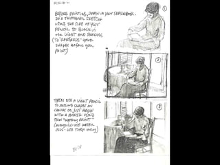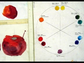 The document outlines a painting lesson by Glenn Hirsch focused on the use of color and light, emphasizing techniques such as glazing and chromatic scales to enhance the perception of light in artwork. It discusses the contrast of warm and cool colors and provides a step-by-step review of painting techniques, including sketching and layering. Additionally, it offers examples of still life paintings and highlights famous artists who utilized these techniques.