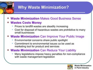 The document discusses waste minimization opportunities and reporting practices in the paint manufacturing industry. It outlines a 5-step waste minimization program that includes conducting an audit to identify waste streams, developing a plan to reduce waste, implementing the plan, and monitoring progress. Various waste reduction, reuse, recycling, and recovery options are presented, such as segregating wastes, implementing quality control, using reusable containers, and blending off-spec products. Success stories from Asian Paints are provided, where waste has been reduced by over 72% through upgraded facilities and innovative processes.