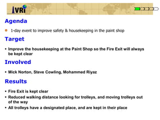 The document outlines a one-day Kaizen blitz event aimed at improving safety and housekeeping in a paint shop. Key actions included organizing trolleys, creating designated storage areas for high and low use trolleys, and cleaning the floor to enhance workflow and ensure clear fire exits. The improvements also included better signage and inventory management to maintain the changes in the workspace.