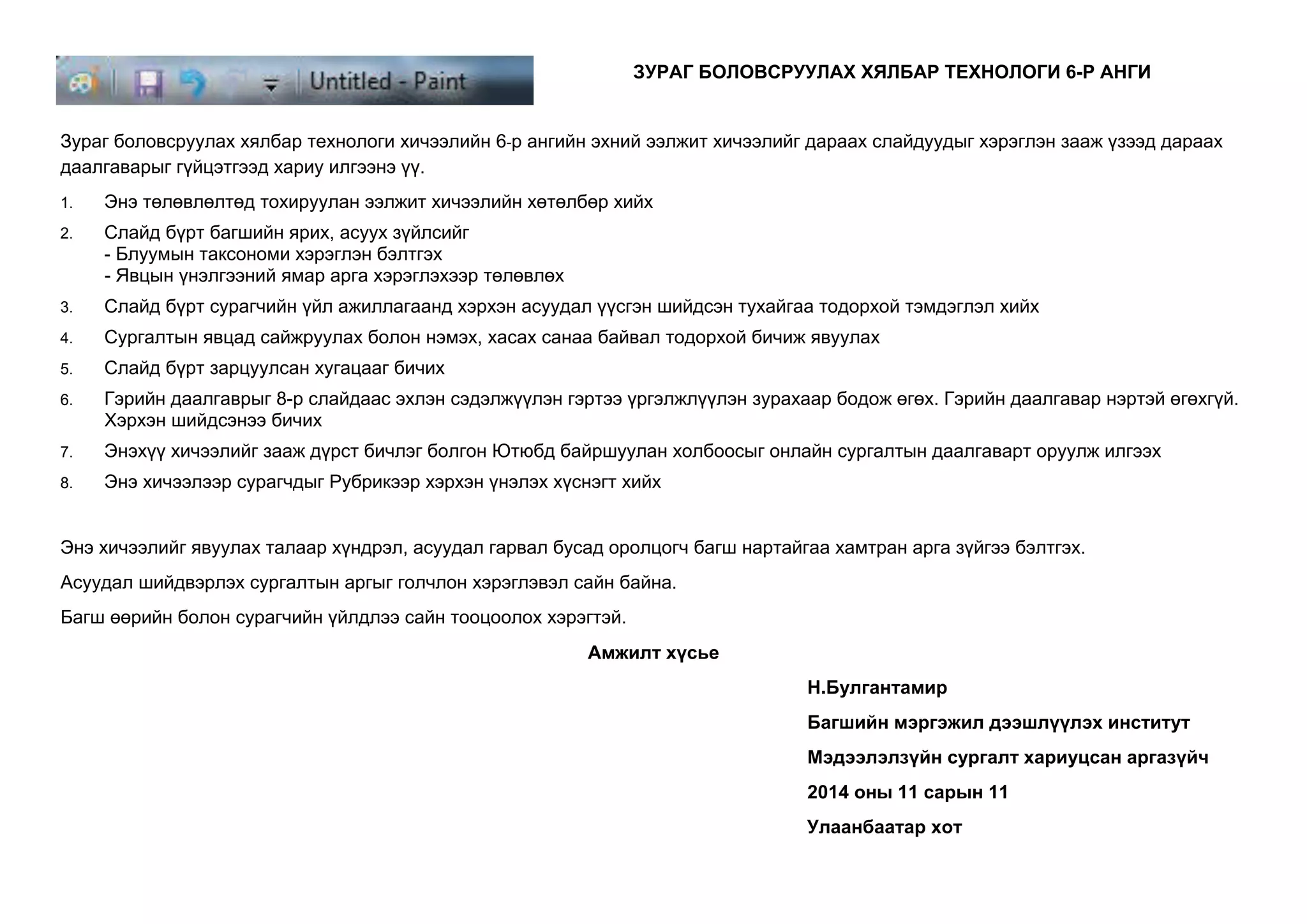 Зураг боловсруулах хялбар технологи хичээлийн 6-р ангийн эхний ээлжит хичээлийг дараах слайдуудыг хэрэглэн зааж үзээд дараах