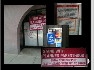 This document discusses the history of narratives surrounding women's reproductive control and the role of Planned Parenthood in shaping those narratives. It notes that in the 19th century, control over reproduction was a private matter for women, but male physicians later framed abortion as morally and medically dangerous, privatizing women's control. Planned Parenthood aims to make reproductive issues public concerns through open discussion of women's experiences. The document argues that demystifying healthcare facilities through narrative can help position services as legitimate public matters.