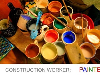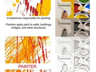 A painter is a construction worker responsible for applying paint to structures like walls, buildings, and bridges. Painters use tools like brushes, rollers, tape, ladders, scrapers, and buckets to prepare surfaces by removing loose particles and flakes, check for dampness, and then apply paint through various methods.