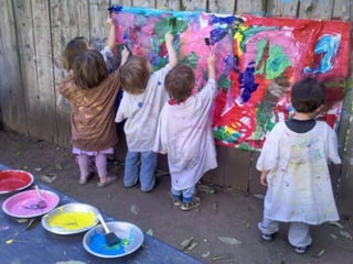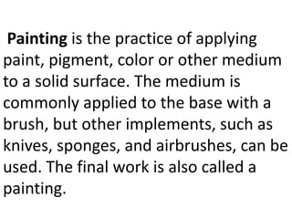 Painting is an art form that involves applying paint to a surface. When children paint, they develop physically by using arm muscles to control brushes, socially by working with others, emotionally by being trusted with messy paint, perceptually by observing visual effects, cognitively by learning painting vocabulary, and in art awareness by responding to artwork. Suitable painting materials for young children include tempera paints, brushes, sponges and rollers. Activities should allow for open-ended exploration, color mixing, and focus on the process rather than products. Teachers should observe children closely and ask open-ended questions to encourage learning during painting.