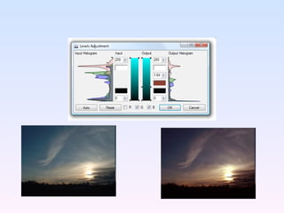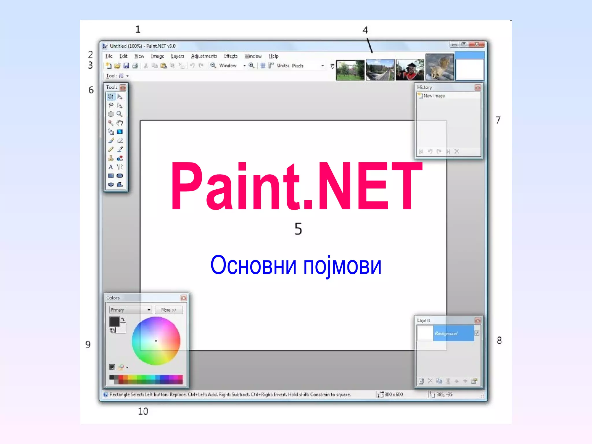 The document outlines the user interface elements and menu options of the software paint.net, detailing components such as the title bar, menu bar, toolbars, and various windows for images, layers, and tools. It provides an extensive list of menus including file, edit, view, image, layers, adjustments, and effects, along with descriptions of their functionalities. Additionally, it describes various image editing effects and adjustments available within the software.