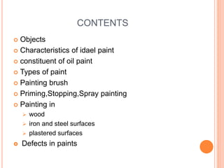 The document outlines the essential characteristics, constituents, and types of paint, as well as various painting techniques and processes for different surfaces. It emphasizes the protective and aesthetic functions of paint, describes ideal properties, and details the steps involved in priming, stopping, and applying paint to wood, metal, and plastered surfaces. Additionally, it discusses the importance of using appropriate brushes and highlights potential defects in paints.