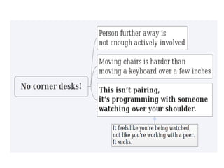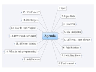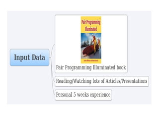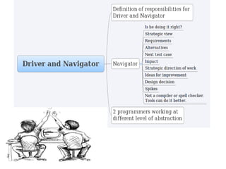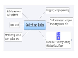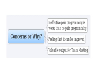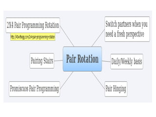 Pair programming involves two developers working together on the same code. There are different types of pairs such as novice-expert and introvert-extrovert. Specific techniques for pair programming include pair hinging, pair stairs, and 2x4 rotation where developers rotate roles every 2-4 hours. Effective pair programming also requires consideration of workspace setup.