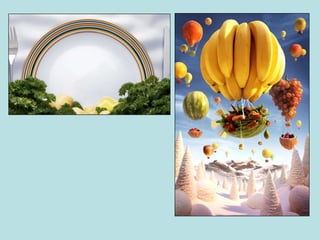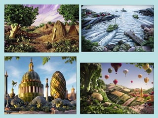 CREACIÓ DE PAISATGESFANTÀSTICS El fotògraf anglès Carl Warner, ha fet una sèrie de fotografies utilitzant només aliments per crear aquesta mena d’escenaris fantàstics que anomena foodscapes. Les seves imatges han format part d’una campanya publicitària per fomentar l’alimentació sana i responsable. Trobaràs més informació sobre la seva obra en el seu lloc web: http:// www.carlwarner.com /