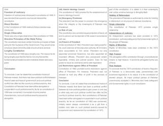 The document summarizes the key features of the constitutions of Pakistan from 1956 to 1973. The 1956 constitution established Pakistan as an Islamic republic with Urdu and Bengali as national languages. It had a unicameral legislature and parliamentary system of government. The 1962 constitution made it more difficult to amend and gave the president significant powers. The 1973 constitution is the current governing document which is a rigid, written constitution with a parliamentary democracy and bicameral legislature. It declares Islam as the state religion and protects fundamental rights and minorities.