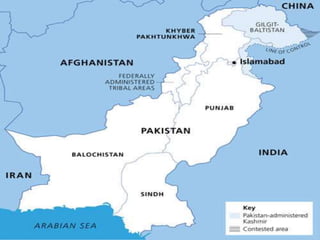 This document discusses the history of relations between Pakistan and India from 1947 to 2016. It outlines several key issues that have caused tensions, including the Kashmir issue, water treaties, terrorism, and unequal distribution of British assets after independence. It also summarizes the major wars between Pakistan and India in 1947, 1965, 1971, and 1999. The document then discusses Pakistan's nuclear program and tests, as well as the effects of India's relationships with neighboring countries like Iran and Afghanistan on Pakistan.