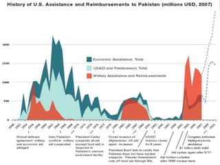 The US-Pakistan relationship has evolved significantly since Pakistan's independence in 1947. Initially based on military and economic support, the relationship strengthened after Pakistan agreed to US requests for bases to monitor the Soviet Union during the Cold War. Cooperation increased further after 9/11 when Pakistan allied with the US against al-Qaeda but also caused public opposition in Pakistan due to civilian casualties from drone strikes. The relationship remains important but complex, with both countries pursuing their own national interests.
