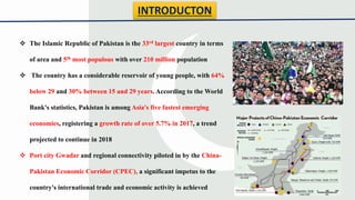 Pakistan is the 5th most populous country with over 210 million people, many of whom are young. It has experienced strong economic growth in recent years. Pakistan faces many internal and external threats to peace and security, including religious extremism and sectarian violence, ethnic clashes, poverty, and tensions with neighboring countries like India and Afghanistan over issues like Kashmir. However, Pakistan has also pursued initiatives to establish peace such as participating in UN peacekeeping missions and attempting to facilitate peace talks in Afghanistan.