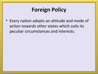 Pakistan's foreign policy is guided by its history, geography, and aspirations. Its key principles are developing friendly relations, safeguarding security and geostrategic interests, resolving the Kashmir issue, promoting Pakistan's image, and protecting economic and expatriate interests. Quaid-e-Azam envisioned a policy of peace, fairness, and support for oppressed peoples. Pakistan's foreign policy has passed through phases including non-alignment, Western alliance, bilateralism, and addressing contemporary issues like terrorism and Afghanistan. Key relationships include close ties with China and Muslim countries, complicated ties with the US, and improving but still complex relations with India.