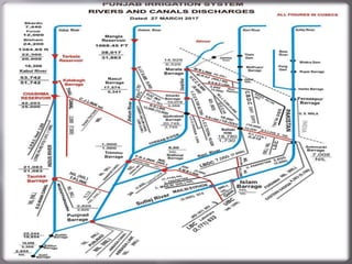 The document discusses the history and development of Pakistan's canal irrigation system since British rule in 1847. It summarizes key irrigation projects Pakistan has undertaken since independence in 1947, including major dams and barrages such as Tarbela Dam, Mangla Dam, Chashma Barrage, and Kotri Barrage. It also outlines several proposed future irrigation projects aimed to further develop Pakistan's water infrastructure.