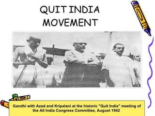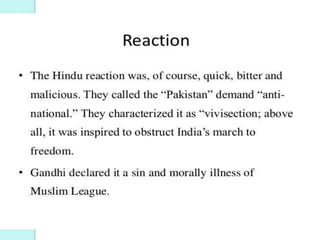 The document summarizes the key events of the Pakistan movement from 1940 to 1947, including the Lahore Resolution of 1940, the Cripps Mission of 1942, the Quit India Movement of 1942, the Gandhi-Jinnah talks of 1944, the Wavell Plan and Simla Conference of 1945, elections from 1945-1946, the Cabinet Mission Plan of 1946, the June 3rd Plan of 1947, the Radcliffe Award boundary demarcation, and finally the Indian Independence Act of 1947 which partitioned British India and led to the independence of Pakistan and India.