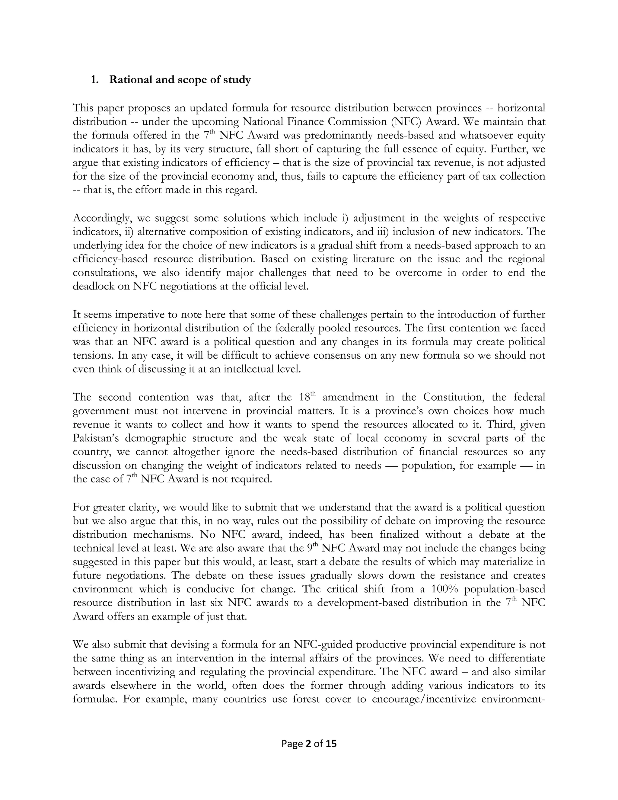 This document proposes an updated formula for the horizontal distribution of resources among provinces under the National Finance Commission (NFC) award, shifting from a solely needs-based approach to one that incorporates efficiency indicators. It outlines challenges in achieving consensus on any new formula, reinforcing the significance of a debate on resource distribution mechanisms, despite the inherent political nature of NFC awards. The paper emphasizes that the distribution will remain needs-based, as population weight will continue to dominate, while advocating for the inclusion of efficiency-focused indicators in future discussions.