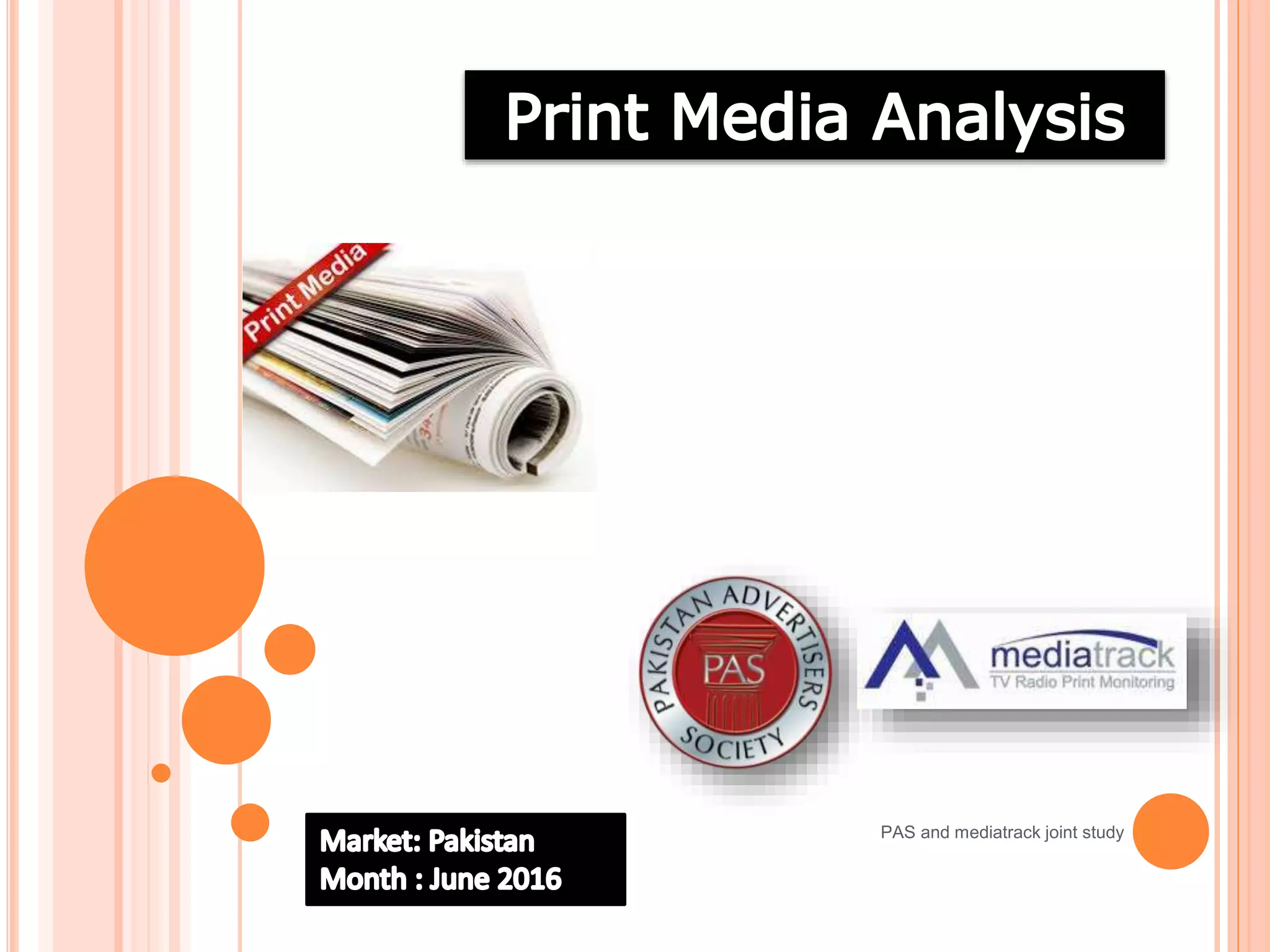 The joint study by PAS and Mediatrack analyzes advertising data from multiple cities in Pakistan, focusing on branded categories while excluding classified ads, job opportunities, and tenders. It examines the spending patterns of over 50 magazines and publications, breaking down data by regions and sectors such as government, construction, and banking. The findings highlight the distribution of ads across various media outlets and geographic locations.
