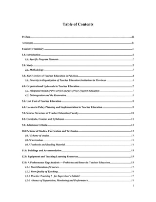 1. Teacher education in Pakistan is administered at the provincial level, but each province has a unique organizational structure and offers different courses, leading to inconsistencies.