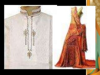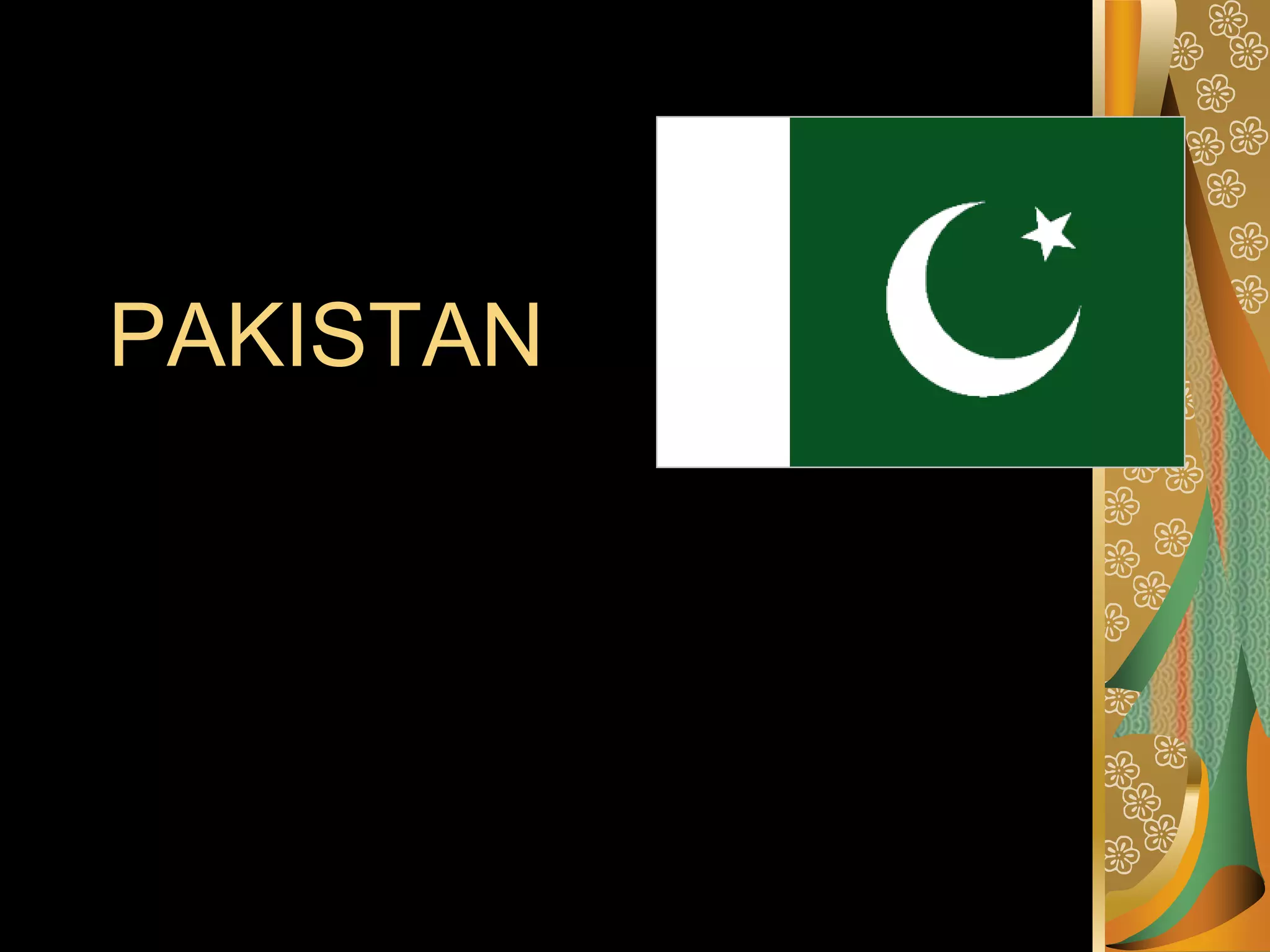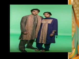Pakistan is a mountainous country located in South Asia between Central Asia and the Middle East. It has a population of over 172 million and its major languages include Punjabi, Pashto, Sindhi, and Urdu. Islam is the dominant religion with over 95% of Pakistanis being Muslim. The economy centers around textiles, chemicals, food processing and agriculture. Traditional dress includes the salwar kameez for both men and women. Health challenges stem from poverty, illiteracy, and inadequate infrastructure in rural areas.