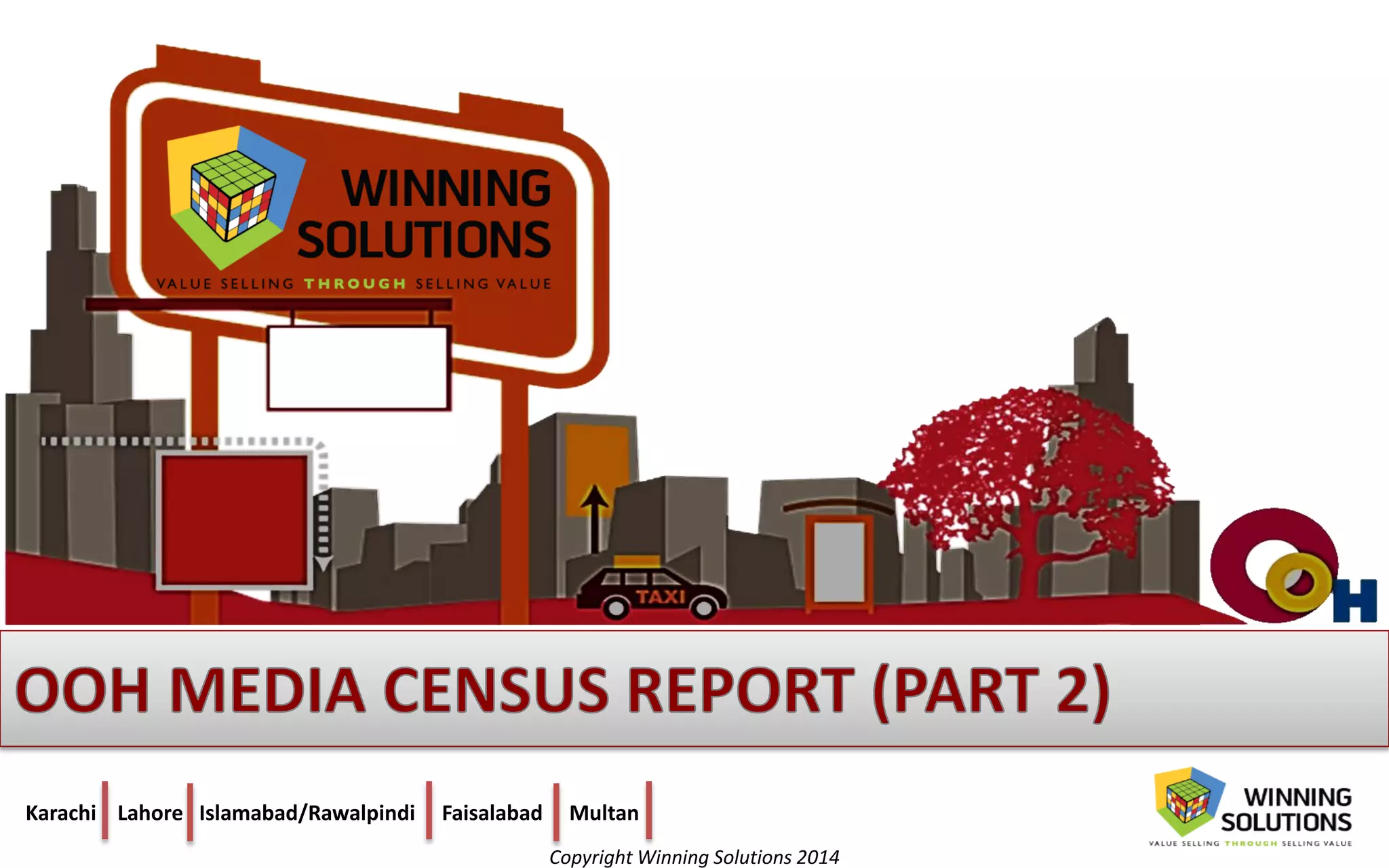 This document provides an overview of an outdoor media census conducted in Pakistan's top 5 cities from February to April 2014. It includes details on the methodology, types of outdoor media counted, total counts and values by city, and breakdowns of outdoor media by type and location. The key findings are that the census counted a total of 9,107 outdoor advertising structures valued at 1.28 billion Pakistani rupees per month, with Karachi accounting for around half the volume and value. Pole signs made up over 50% of all outdoor media.