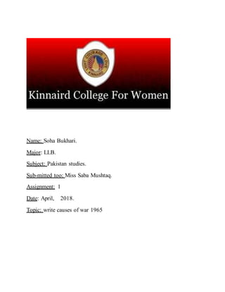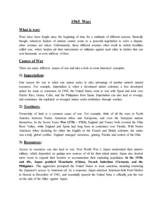 This document provides background information and key details about the 1965 war between India and Pakistan over the disputed Kashmir region. It discusses the causes of the war, including territorial disputes and Pakistan's desire to take Kashmir by force. It describes some major battles between Indian and Pakistani forces, and notes that the war ended in a stalemate. The aftermath saw international pressure and a ceasefire negotiated in Tashkent that restored the pre-war status quo.