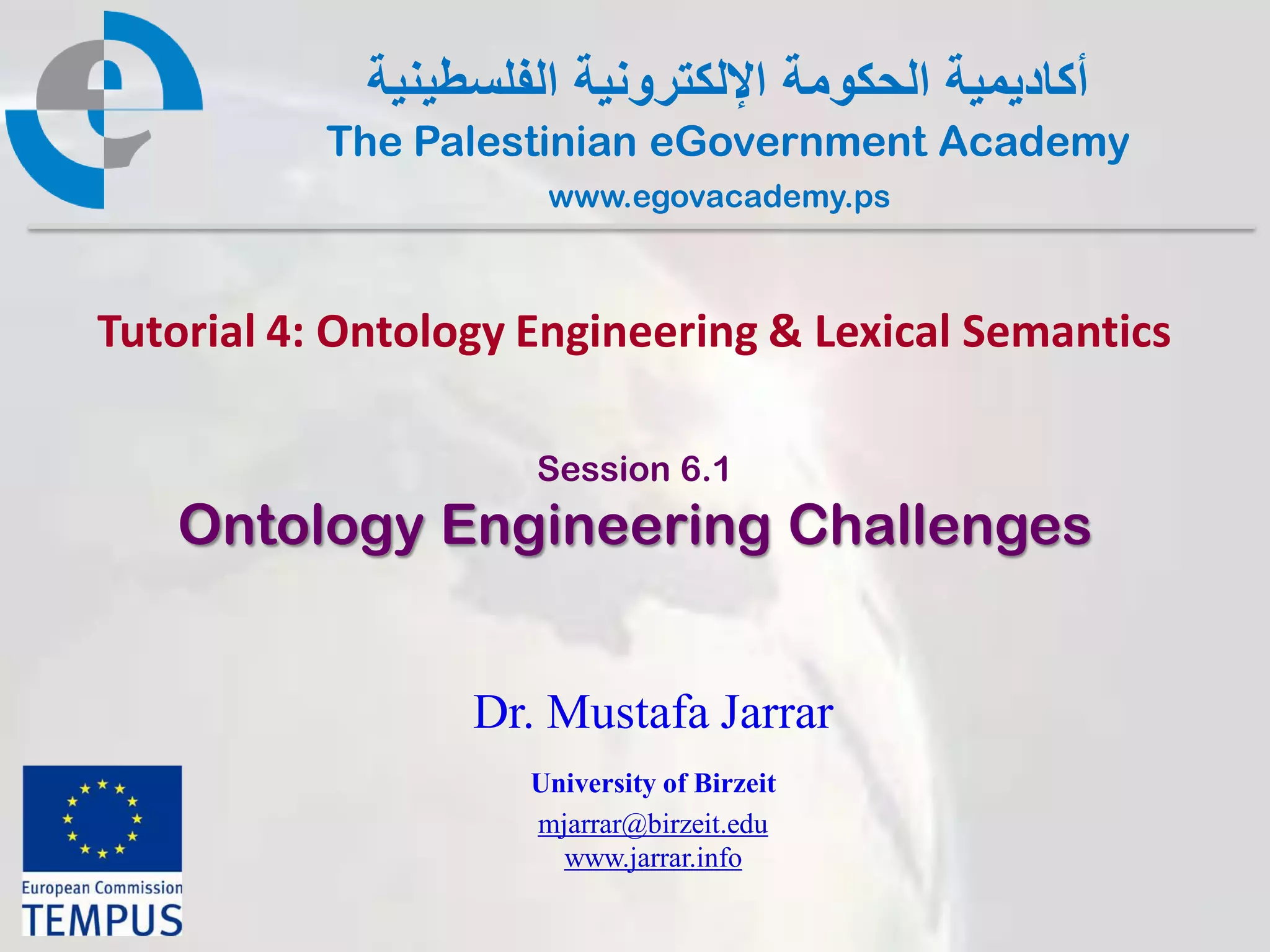 This document discusses two main challenges in ontology engineering: ontology reusability versus usability, and ontology application dependence. Regarding reusability and usability, there is a tradeoff - an ontology can either be highly reusable across different applications or highly usable for a specific application, but not both. Regarding application dependence, representing a domain for problem-solving purposes is influenced by the problem and intended use, which can lead to conflicting axiomatizations even if they agree at the domain level. The document uses examples to illustrate these challenges.