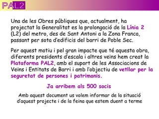 Una de lesObres públiques que, actualment, ha projectat la Generalitat es la prolongació de la Línia 2 (L2) del metro, des de Sant Antoni a la Zona Franca, passant per sota d’edificis del barri de Poble Sec. Ja arribem als 500 socis Amb aquest document us volem informar de la situació d’aquest projecte i de la feina que estem duent a terme Per aquest motiu i pel gran impacte que té aquesta obra, diferents presidents d’escala i altres veïns hem creat la Plataforma PAL2 , amb el suport de les Associacions de Veïns i Entitats de Barri i amb l’objectiu de vetllar per la seguretat de persones i patrimonis. PAL2