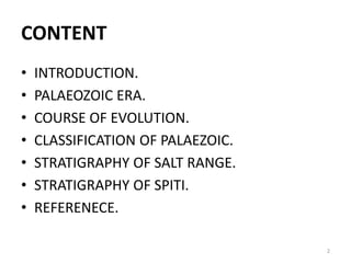 The document summarizes Palaeozoic stratigraphy in India, specifically in the Salt Range and Spiti regions. It describes the major periods of the Palaeozoic Era from Cambrian to Permian. For the Salt Range, it details the stratigraphy, including key formations like the Saline Series composed of gypsum, marl and rock salt. It also notes important economic minerals found in the Salt Range. For Spiti, it outlines the stratigraphy of the Cambrian rocks known as the Haimanta System, divided into lower, middle and upper subdivisions. Fossils found in both regions are also briefly mentioned.