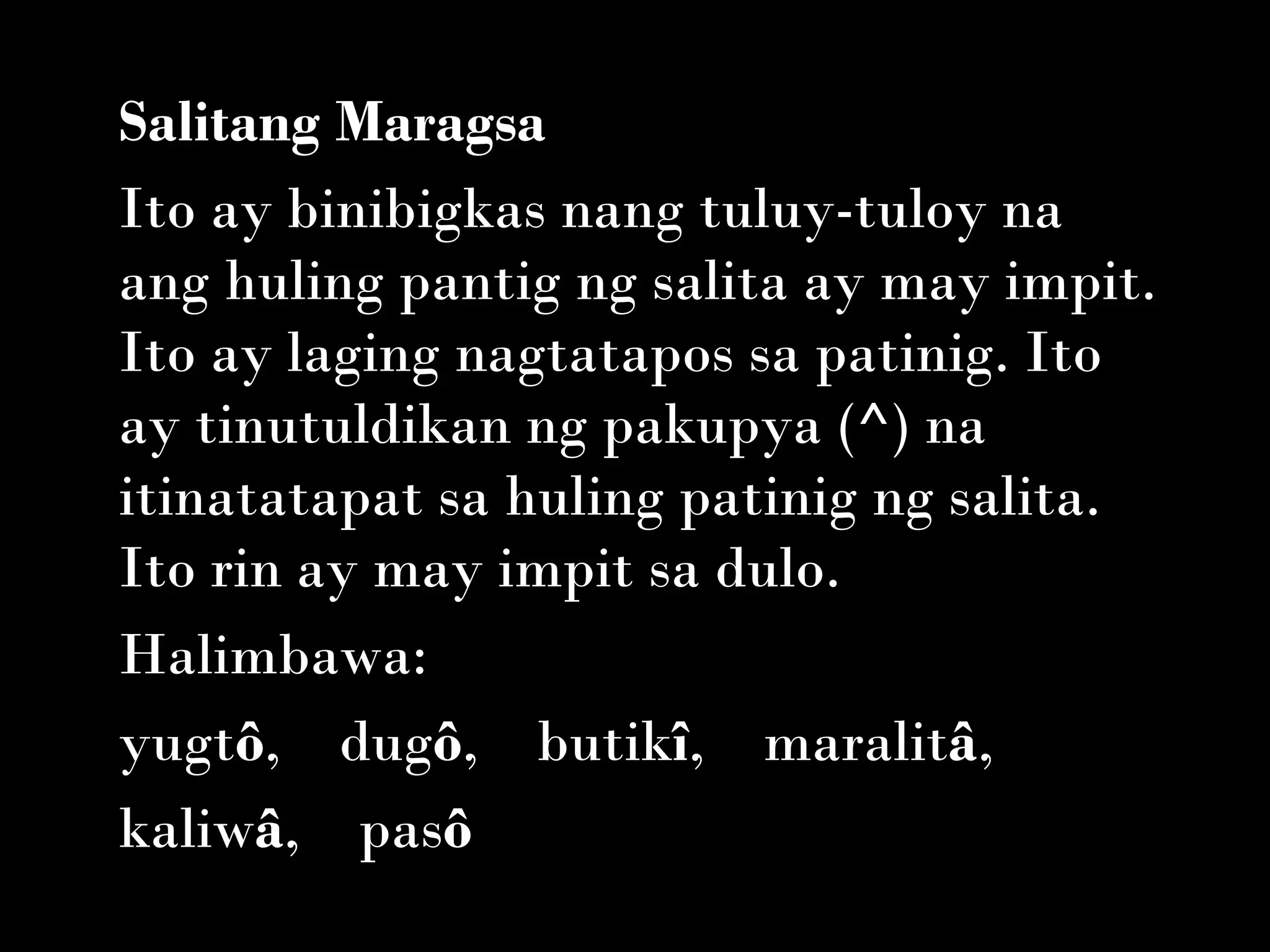 Ang dokumento ay naglalarawan ng iba't ibang uri ng mga salitang ayon sa kanilang bigkas at tuldik. Mayroong salitang maragsa, mabilis, malumay, at malumi, na may kanya-kanyang katangian at halimbawa. Tinukoy rin ang mga tuldik na ginagamit sa bawat uri, tulad ng pakupya, pahilis, at paiwa.