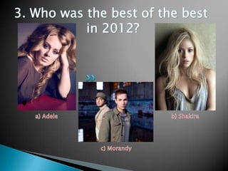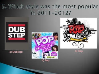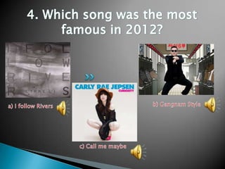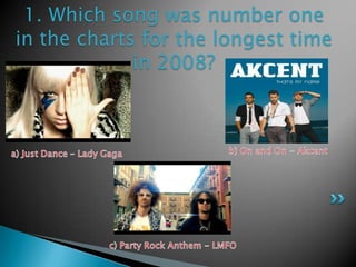 This document appears to be a quiz containing 5 multiple choice questions. The first question asks which song was number one in the charts for the longest time in 2008. The second question asks for the name of Katy Perry's most famous album. The document provides the questions but no answers.