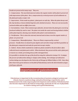 Plants that lived millions of years ago and became embedded in stratified rock provide the most accurate links in plant evolution and genetics. Fossils are preserved in many ways such as compressions, impressions, incrustations, casts, petrification, and inclusion in amber, with each method preserving different details of the plant. Paleobotany is important for reconstructing ancient ecosystems, climate, and the development and evolution of plants by studying plant fossils preserved in various forms and using techniques like radiocarbon dating to determine the age of fossils.