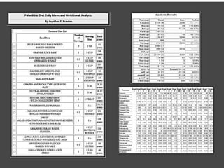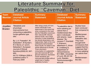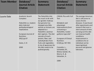 The document presents a team's research on the Paleolithic diet, including summaries of journal articles finding benefits from the diet such as reduced blood pressure and improved cholesterol levels. Each team member contributed a journal article summary and website summary on the Paleolithic diet. The document also includes examples of Paleolithic diet meal plans and nutrient analyses showing the diet provides adequate nutrients.