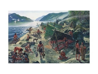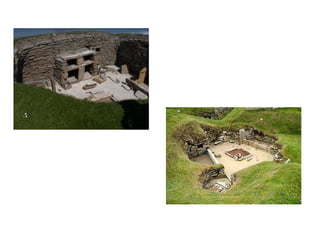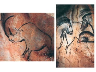 The document summarizes key developments from the Paleolithic period including the emergence of stone tool technology, the movement of humans from caves to villages, and early forms of shelter, art, and symbolic communication. Stone tools allowed humans to cut, shape, and work wood, enabling the creation of projectile weapons, shelters, and other technologies. Cave paintings provided early expressions of beliefs and perspectives on life. Archaeological artifacts and remains like the Skara Brae houses in Orkney, Scotland provide clues about Paleolithic life and how societies were organized.
