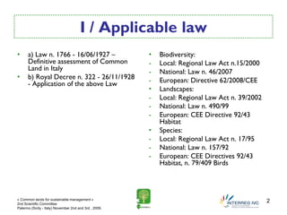 This document summarizes discussions from a scientific committee meeting about the sustainable management of common lands in Sicily, Italy. It outlines the applicable laws regarding biodiversity, landscapes, and species at the local, national, and European levels. It also describes the owner-user relationships and management of lands in one municipality, including a SWOT analysis. Finally, it discusses the evolution of land use in the area and challenges of balancing traditional usage rights with conservation directives.