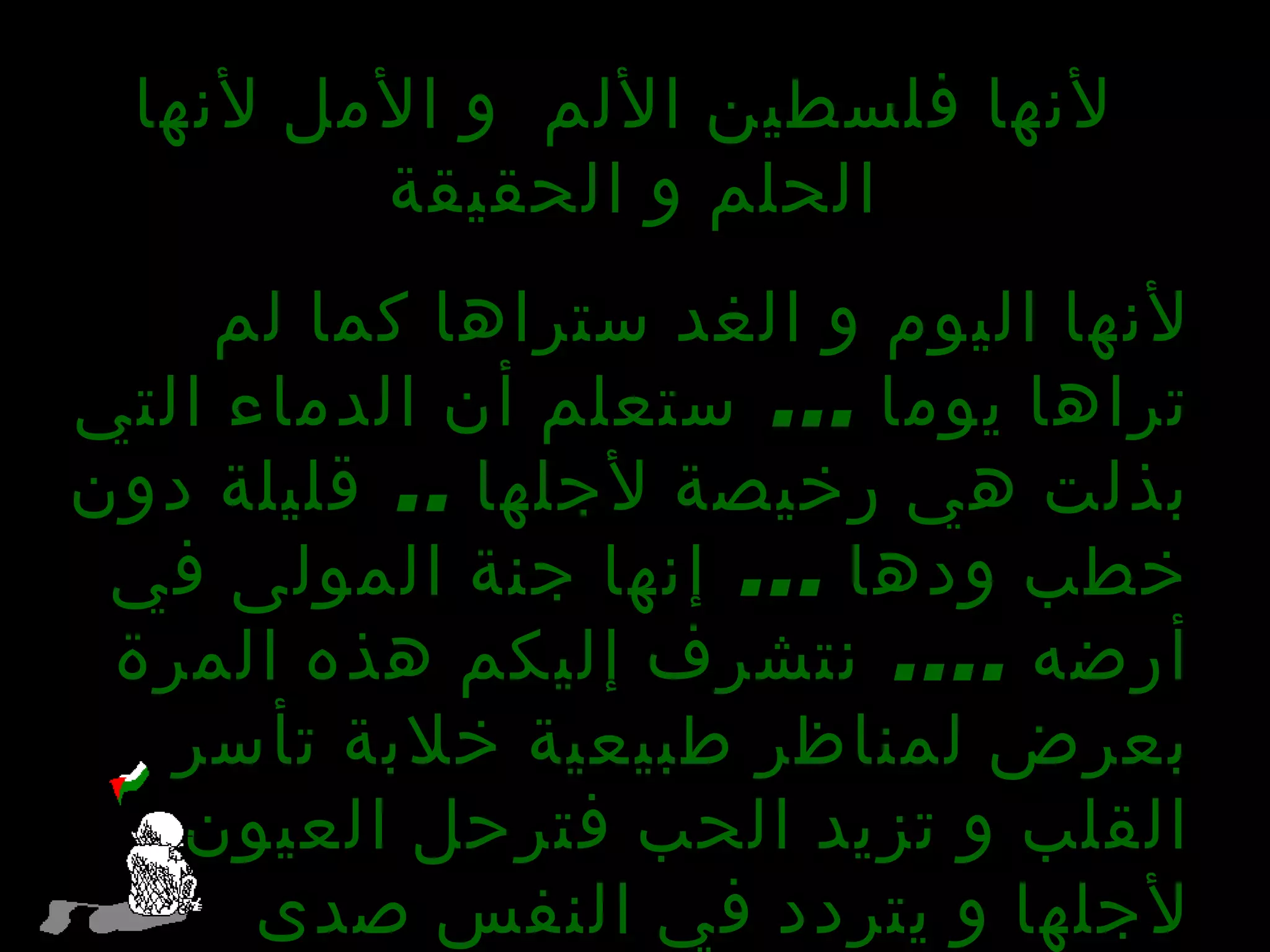 لأنها فلسطين الألم و الأمل لأنها الحلم و الحقيقة لأنها اليوم و الغد ستراها كما لم تراها يوما ... ستعلم أن الدماء التي بذلت هي رخيصة لأجلها .. قليلة دون خطب ودها ... إنها جنة المولى في أرضه .... نتشرف إليكم هذه المرة بعرض لمناظر طبيعية خلابة تأسر القلب و تزيد الحب فترحل العيون لأجلها و يتردد في النفس صدى صوتها .... إنها أغلى من النفس و الأهل و الولد ..... فلسطين الفجر الباسم ... والنصر القادم