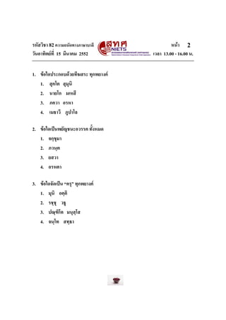 15 มีนาคม 2552 เวลา 13.00 - 16.00 น. 2 1. ขอใดประกอบดวยทีฆสระ ทุกพยางค 1. สุคโต สุมุนิ 2. นายโก มเหสี 3. ภควา อรหา 4. เมธาวี ภูปาโล 2. ขอใดเปนพยัญชนะอวรรค ทั้งหมด 1. จกฺขุมา 2. ภวนฺต 3. ยสวา 4. อรหตา 3. ขอใดจัดเปน “ครุ” ทุกพยางค 1. มุนิ อคฺคิ 2. รชฺชุ วธู 3. ปณฺฑิโต มนุสฺโส 4. จนฺโท สทฺธา