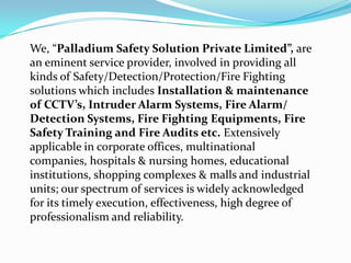 Palladium Safety Solutions Pvt. Ltd. provides a wide range of safety, detection, protection, and firefighting solutions including installation and maintenance of CCTV, intruder alarms, fire alarms, firefighting equipment, fire safety training, and fire audits. They serve corporate offices, hospitals, educational institutions, shopping complexes, malls, and industrial units. The document then discusses their offerings in more detail including firefighting systems, fire alarm and detection systems, intrusion alarms, surveillance systems, and access control systems.