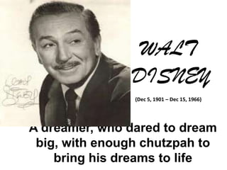Walt Disney was an American entrepreneur and animator who founded The Walt Disney Company. In 1923, after filing for bankruptcy with his Laugh-O-Gram studio, Walt and his brother Roy Disney founded the Disney Brothers Cartoon Studio and signed a contract with M.J. Winkler Productions to produce the Alice Comedies cartoon series. Walt Disney continued producing animated shorts throughout the 1920s, including introducing Mickey Mouse in 1928. By the 1930s and 1940s, Disney produced landmark animated feature films such as Snow White and the Seven Dwarfs, Pinocchio, Fantasia, and built Disneyland theme park in 1955. Walt Disney revolutionized the animation and entertainment industry before his death in 1966.
