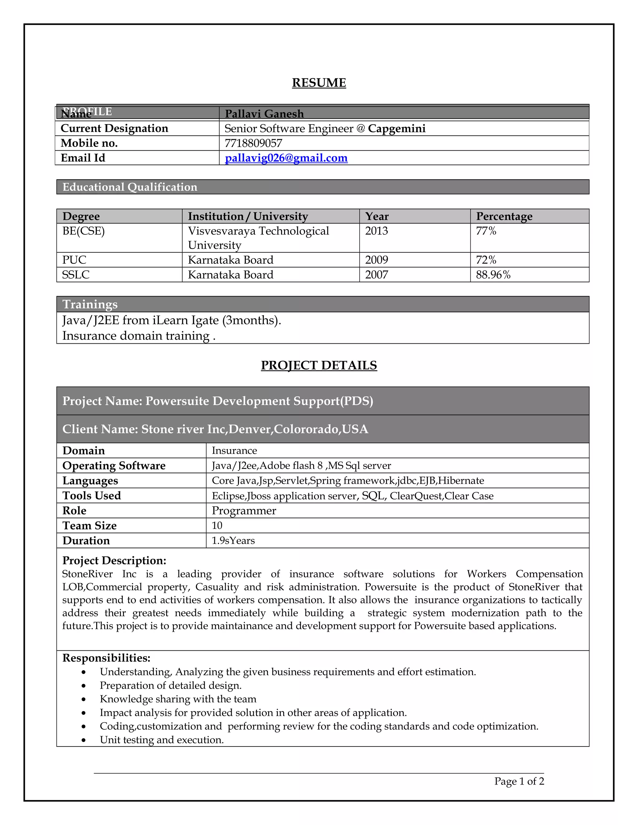 Pallavi has a BE in computer science from Visvesvaraya Technological University with 77% marks. She has 3 months of training in Java/J2EE and insurance domain training. She worked as a programmer for 1.9 years on the Powersuite Development Support project for Stone River Inc in Colorado, USA. Her responsibilities included requirements analysis, design, coding, testing, documentation and attending meetings. She has strong skills in Java, JSP, Servlet, Spring and SQL.