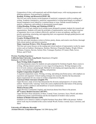 Kim J. Palmore has extensive experience in teaching and administration in higher education. She holds a Ph.D. in English from UC Riverside and has taught courses in composition, literature, and creative writing at De Anza College and California State University, Long Beach. Her administrative experience includes directing a professional development program for graduate students at UC Riverside. Her research focuses on gender and identity expression in literature.