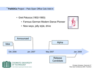 The PalOOCa Project is developing an Open Office Calc add-in for the Palo OLAP server. It began as an idea in October 2006 and reached an alpha release in January 2007. The project aims to create an open source MOLAP front-end that allows users to connect to Palo from within OpenOffice Calc, similar to existing Excel plug-ins. A roadmap outlines planned features through a final 1.0 release in January 2008, including connection management, data import/export, and multilanguage support. The presentation demonstrated PalOOCa on Windows and Linux and provided download and contact information.