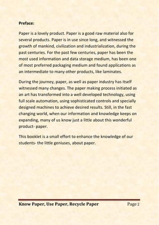 This document provides an overview of paper for students. It discusses that paper is widely used in packaging, books, and other applications. The paper industry has transformed from an art to a technology-driven process using automation. It then discusses the history of paper, interesting facts about paper and the paper industry in India. Some key facts include that India uses 4% of global paper production while having 17% of the population, 73% of Indian paper is made from recycling, and the paper industry is not a major cause of deforestation in India.