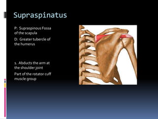This document provides a review of palpation techniques for various muscles to be tested on a final exam. It describes the origin, insertion, and actions of muscles like the supraspinatus, deltoid, biceps brachii, and others. For each muscle, it outlines how to position the client and palpate the muscle as they perform specific movements like abduction, flexion, or extension. The review covers muscles of the shoulder, arm, forearm, wrist, hand, neck, back, and pelvis.